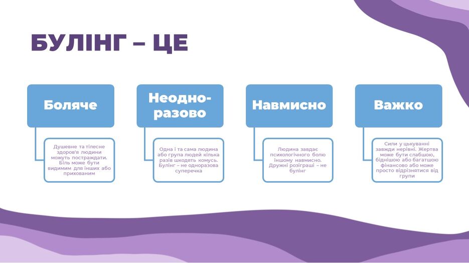 Ознайомлення з поняттям, видами та прикладами кібербулінгу у шкільному середовищі та поза ним.