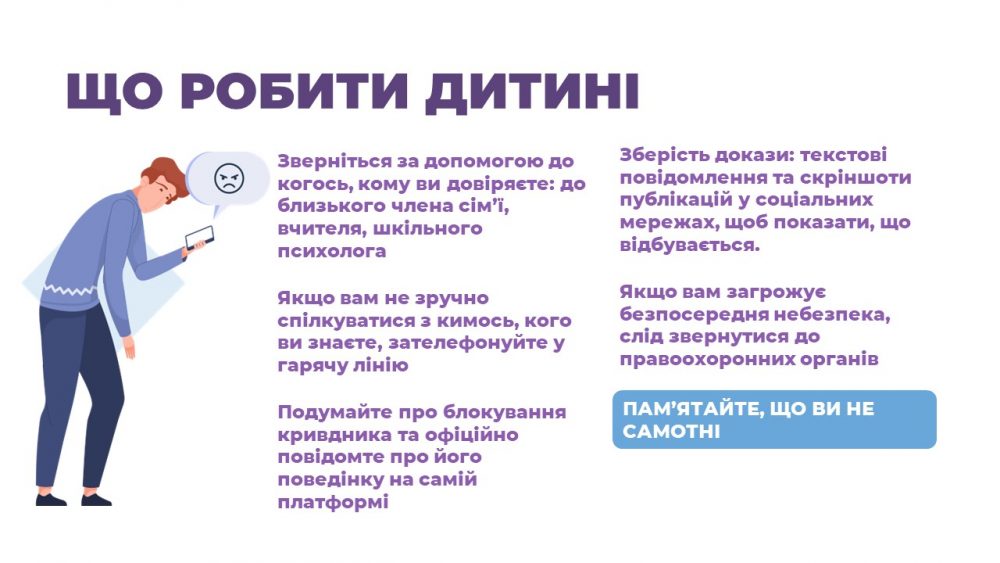 Алгоритм дій для учнів: до кого звернутися по допомогу, як зберігати докази та уникати небезпечних ситуацій.